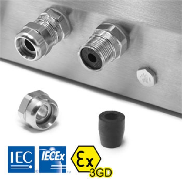 • PG7 and PG9 cable glands with adapters for 4 to 7 mm and 7 to 10 mm cable routing. Equipped with anti-friction system that does not require additional external cable fixing, as required by the IECEx scheme and ATEX directives.