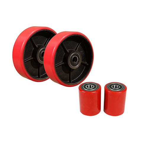 This set combines a pallet jack load wheel set with a pallet jack steering wheel set, making it suitable for workshops and warehouse operators managing pallet jack replacement parts and pallet truck replacement parts.