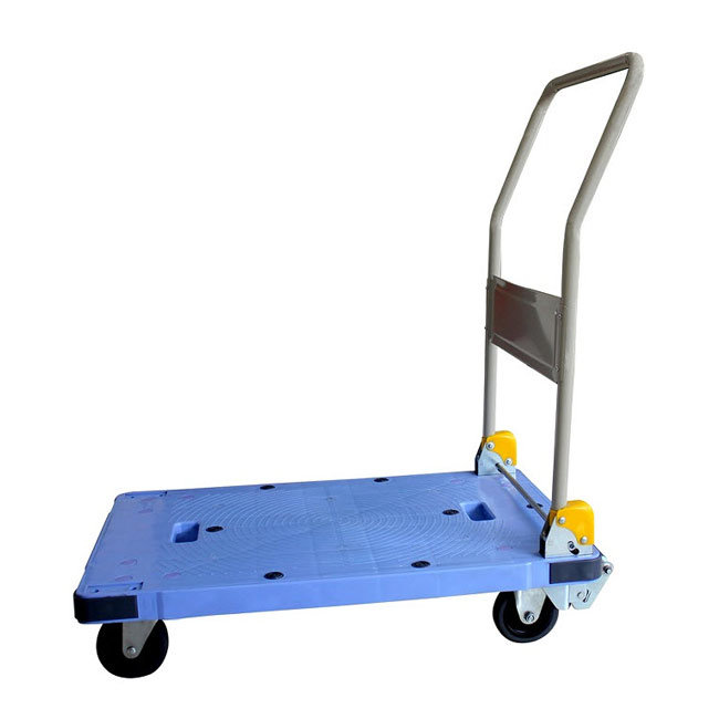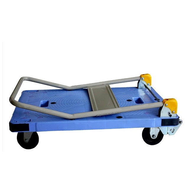 It is made with good quality material, this platform trolley is strong and reliable enough to carry any type of loads, that are as heavy as up to 300 kg. Blue plastic body, high grade appearance, high strength design makes this heavy duty folding platform truck trolley unique. It has strong wheels which enable it to be pushed forward placidly and smoothly. It has a metal and folding handle which makes it easy for you to operate