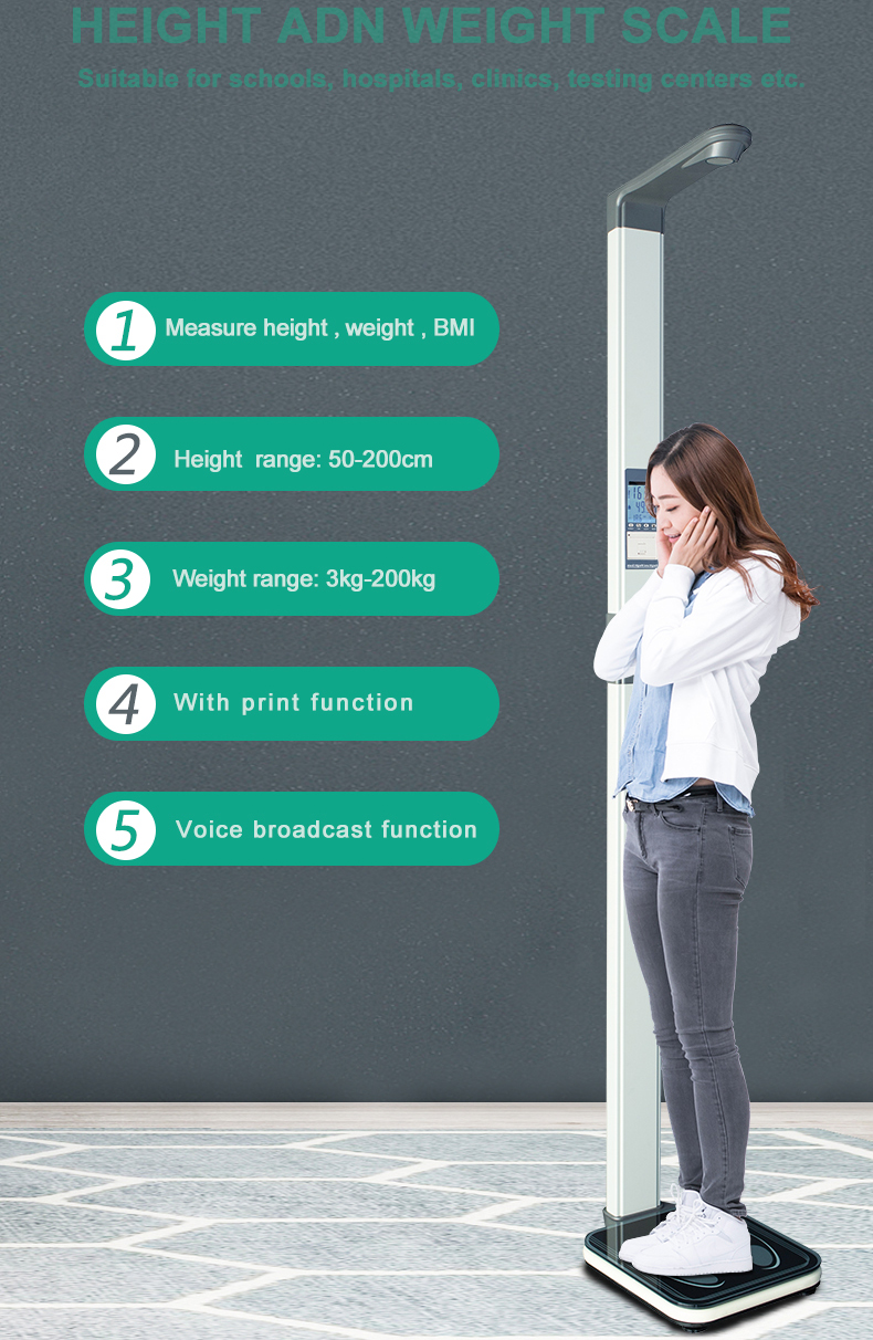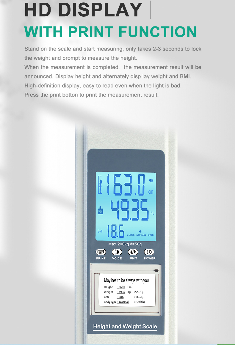 | Function : | Height measuring function/Weight measuring function BMI /Voice function,Review function, With themal printer, print the result |
